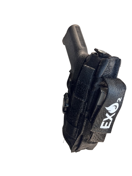 Funda para cinto con cierre anti-perdida que puede portar un activador EXO2 y hasta dos capsulas (una en el activador y otra en el bolsillo superior) materializada en cordura y cierres de clip y velcros, se deberá especificar si el operador es diestro o zurdo al realizar el pedido.